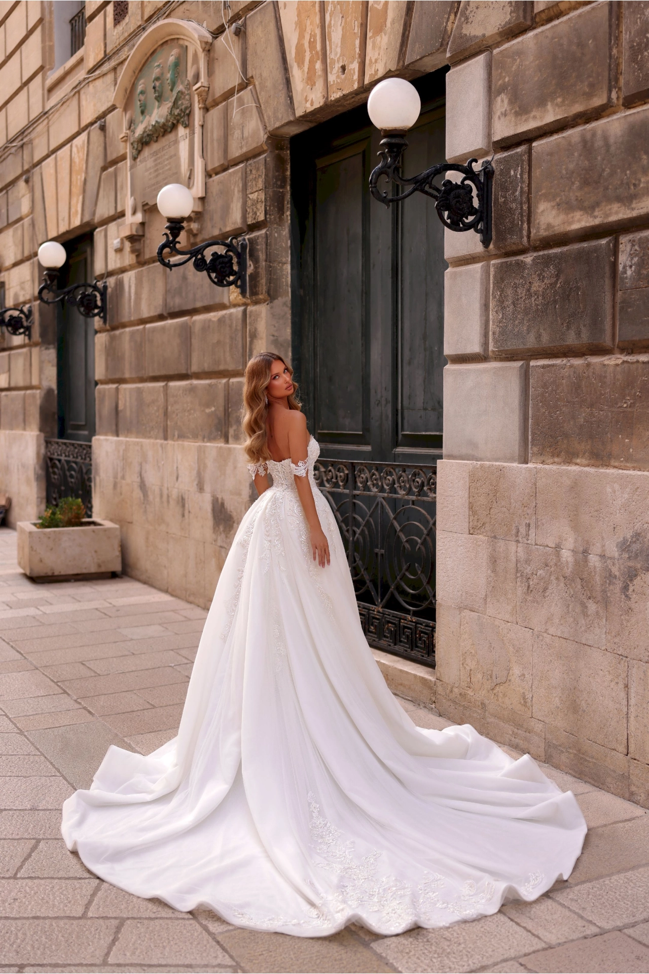 Strapless sweetheart neckline mermaid gown constructed of soft tulle and beaded lace embellishments. Paired with a matching overskirt.